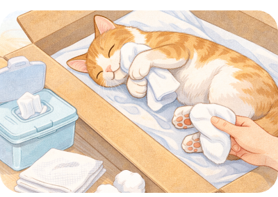 汚れが気になる場合は、濡らしたタオルやウェットティッシュで優しく拭いてあげましょう。鼻や肛門から体液が出る場合には、清潔なガーゼや脱脂綿を使って整えます。これだけでもご家族の気持ちが落ち着きやすくなります。