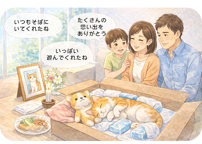 ペットが普段使っていたお気に入りの毛布やおもちゃ、写真などをそばに置いてあげると、ご家族としても少し心が落ち着きます。好物をお供えする場合はラップや紙で包んでから置くと、その後の処理もスムーズです。