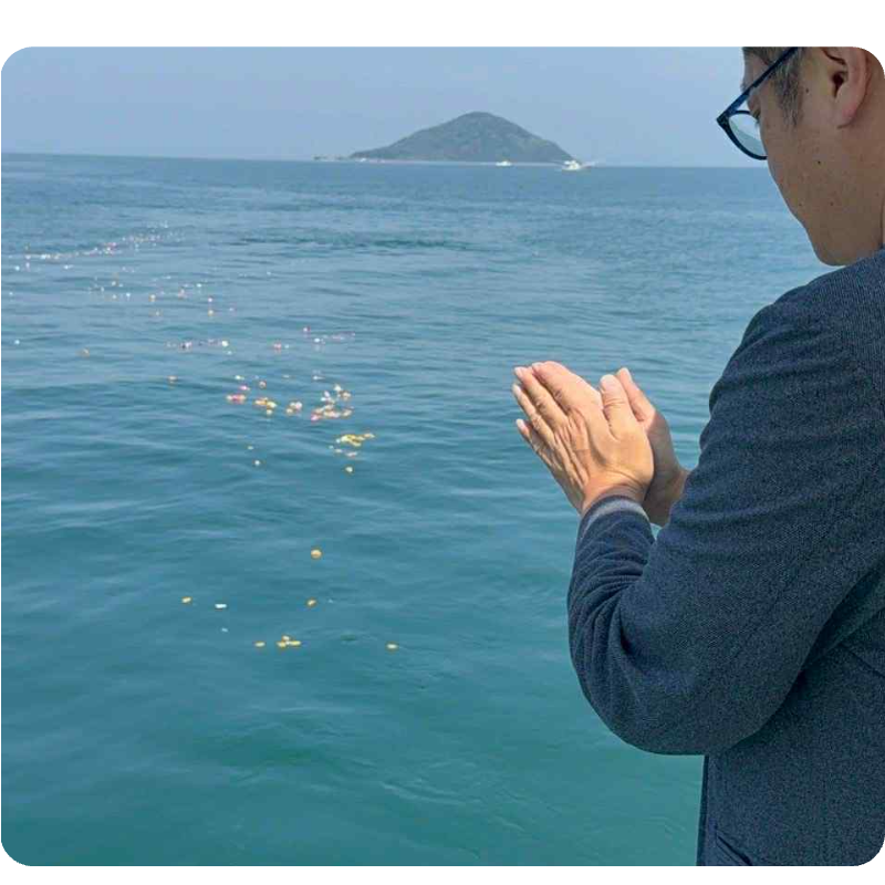 ペット火葬の事例4福岡の出張ペット火葬のアルペット お客様よりありがたいお言葉を賜りました。心を込めてお手伝いさせて頂きます。 散骨後の献花の様子 クリックで拡大表示 2025年5月13日、海洋散骨供養を行いました。 糸島の沖合にてパウダー加工したご遺骨を海洋散骨させていただきました。旅立ちのお手伝いをさせていただいたワンちゃん、ネコちゃんをはじめご縁のあったペットちゃん達を自然界にお戻ししました。 -出張エリア- 福岡県全域、佐賀県全域、 熊本県北部、大分県西部 -お支払い方法- 現金、またはクレジットカード決済可能です。