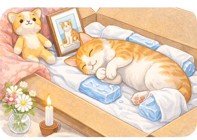 夏場や暖かい季節は腐敗が早く進みやすいため、保冷剤やドライアイスで体を冷やすことが大切です。保冷剤はタオルで包み、お腹や背中の周りに置くと効果的です。また、直射日光や暖房を避け、涼しい静かな場所に安置してください。