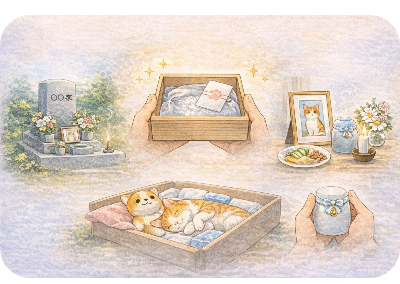 ペットが普段使っていたお気に入りの毛布やおもちゃ、写真などをそばに置いてあげると、ご家族としても少し心が落ち着きます。好物をお供えする場合はラップや紙で包んでから置くと、その後の処理もスムーズです。